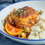 Easy Moroccan Chicken includes warm spices, bright lemon, and green olives which contribute to a nice complex flavor. It's utterly delicious over spaghetti squash or cauliflower pilaf.