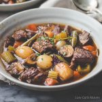 A rich tasting low carb beef stew without potatoes featuring meltingly tender beef chuck and perfectly cooked vegetables. Your gluten-free ketogenic diet just got better.